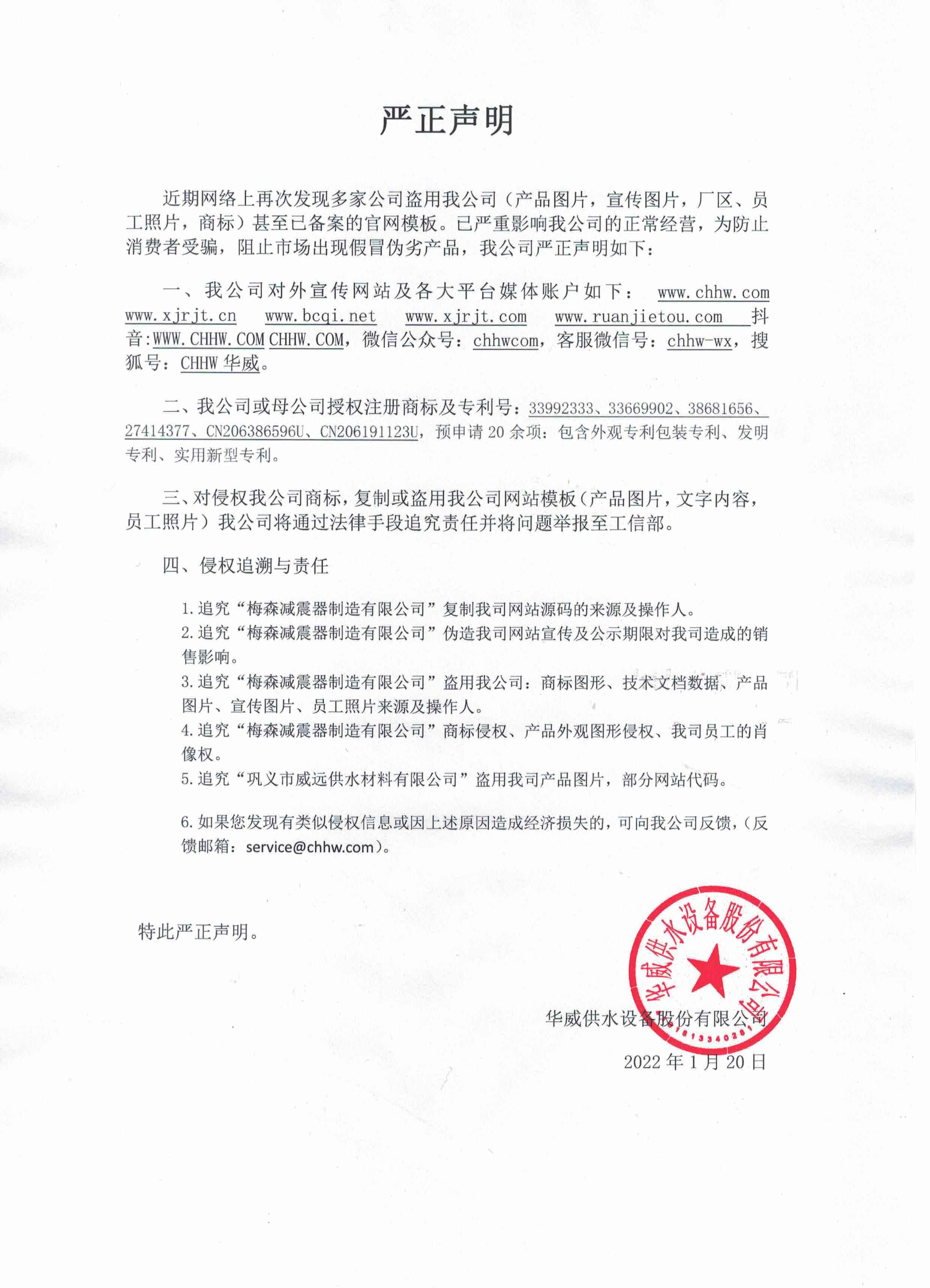 近期網絡上再次發現多家公司盜用我公司(產品圖片,宣傳圖片,廠區、員工照片,商標)甚至已備案的官網模板。已嚴重影響我公司的正常經營,為防止消費者受騙,阻止市場出現假冒偽劣產品,我公司嚴正聲明如下: