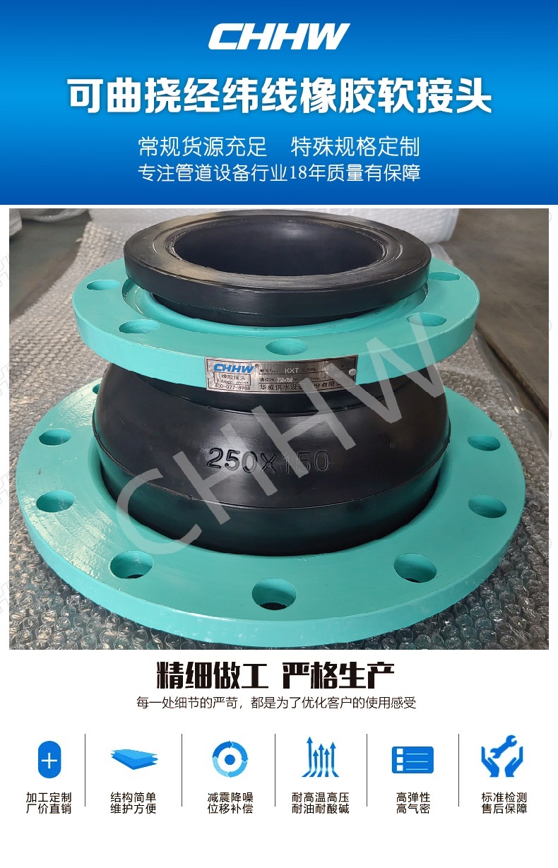 CHHW華威牌可曲撓異徑橡膠軟接頭光澤度高,彈性好,膠質不含再生膠,使用品牌天然橡膠(NR)、氯丁橡膠(CR)、氟橡膠(FKM)、輔料均為國內外知名品牌,球體無異味,使用航空鋼絲銅焊成圈,固定硫化防脫盤能力出眾;耐老化程度是一般球體的5倍;先進的自動成型機成型,纏繞為實心纏繞法,耐高壓,試驗壓力達50公斤,抗橫向拉力是手工成型的3倍;通過日本精度模具,自動硫化機恒溫硫化制成,可以過水、蒸汽、弱酸堿等介質,杜絕球體冒汗現象,球體壽命可達≥5~10年。